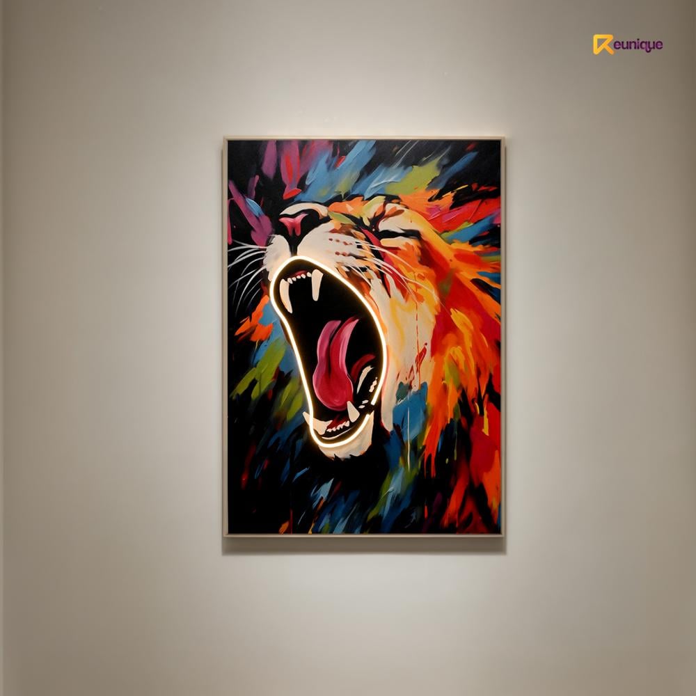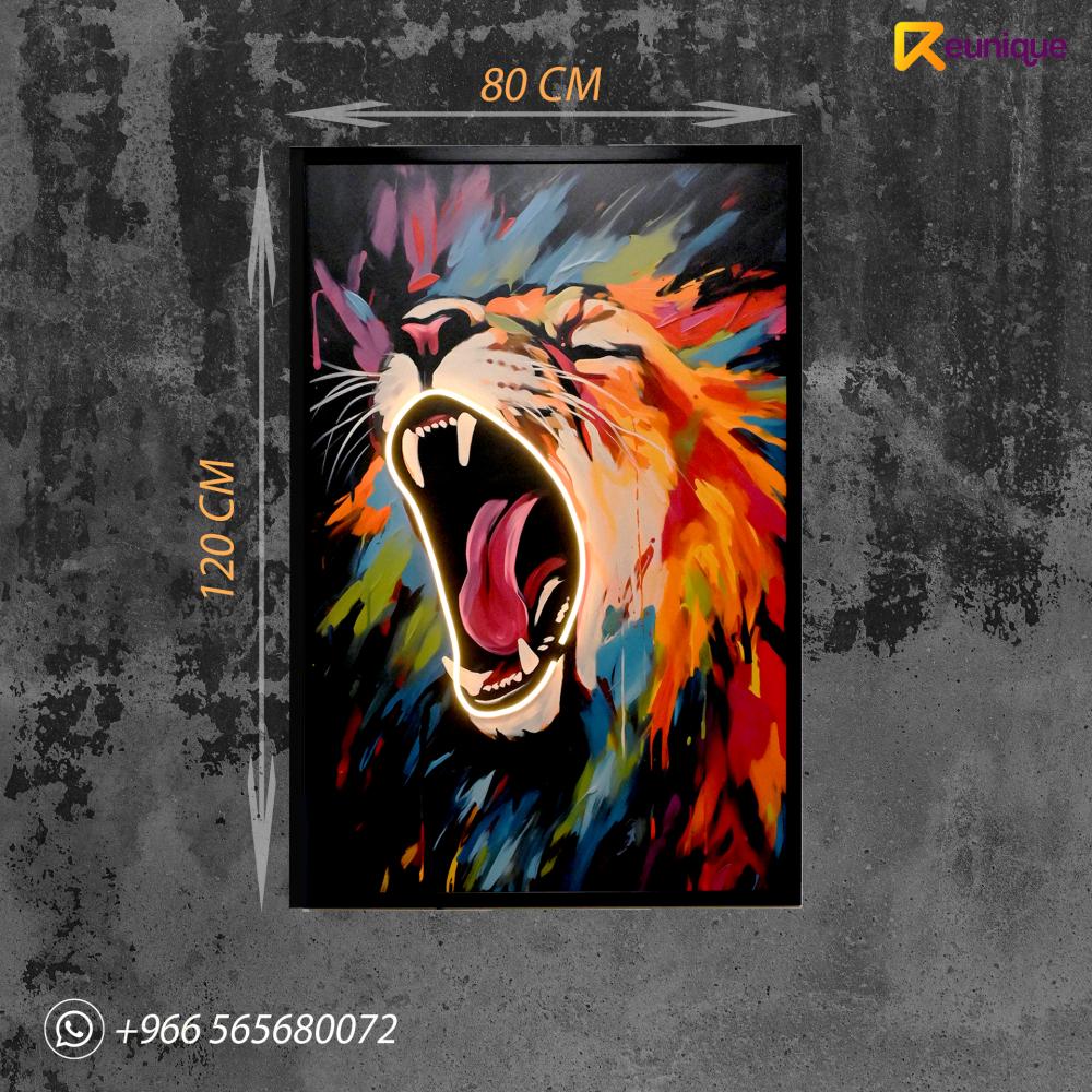 عبر عن القوة والشموخ بأناقة غير تقليدية مع لوحة أسد مودرن مضيئة. تصميم عصري جريء يجمع بين هيبة الأسد ولمسة فنية راقية مغطى بإضاءة ناعمة تضيف عمقا وشخصية للجدار. مثالية للمجالس غرف النوم أو حتى المكاتب التي تبحث عن حضور بصري مميز.