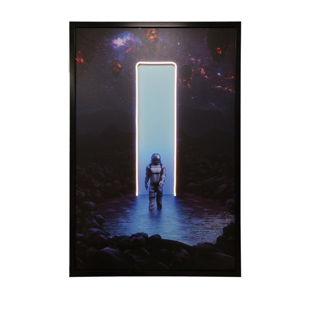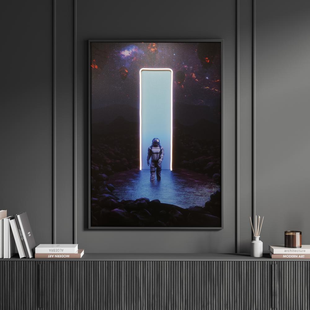 عندما يجتمع الغموض بجاذبية المجهول، تظهر لوحة فنية تجسد رائد فضاء يتقدم نحو بوابة مضيئة في عمق الكون. قطعة فنية ملهمة تنطق بروح المغامرة والاكتشاف، وتمنح المكان لمسة عصرية حالمة تُشعل الخيال وتدعو للتأمل.